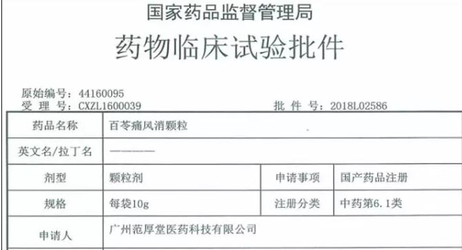2018Äê7Ô£¬·þÎñ¿Í»§¹ãÖÝ·¶ºñÌÃÒ½Ò©¿Æ¼¼ÓÐÏÞ¹«Ë¾É걨µÄÖÐÒ©6.1ÀàÐÂÒ©¡°°ÙÜßÍ´·çÏû¿ÅÁ£¡±»ñµÃCFDA½ÒÏþµÄÒ©ÎïÁÙ´²ÊÔÑéÅú¼þ£»