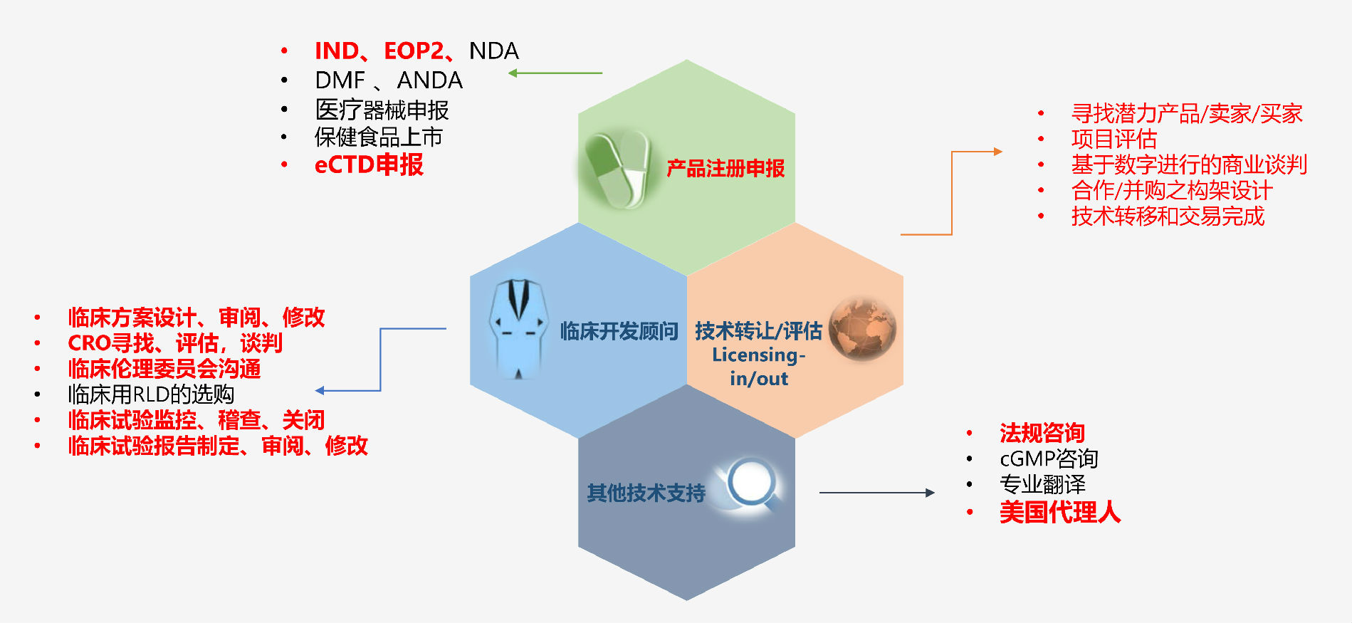 Õë¶ÔFDAËùͳÁìµÄÒ½Ò©²úÆ·£¬´Ó²úÆ·µÄÑз¢¡¢×¢²áÉ걨µ½Êг¡¿ªÍØ£¬¿ÉÒÔÌṩһϵÁÐÅäÌ××Éѯ·þÎñ¡£