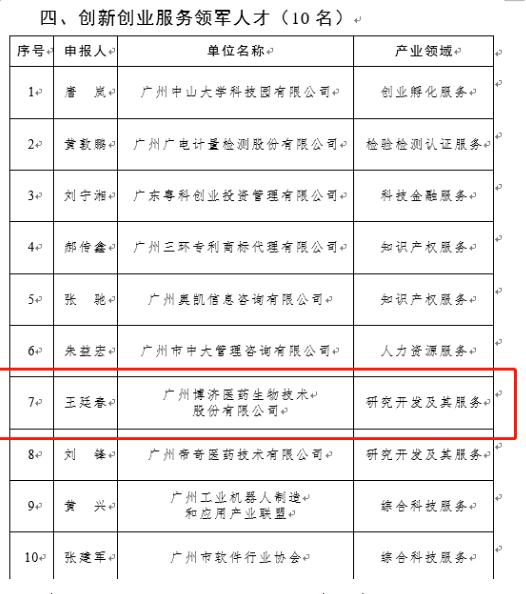 日前,广州市人才事情向导小组办公室印发了《2019年度广州市工业领武士才重点项目拟入选职员(团队)公示》,333体育官网医药董事长王廷春博士作为立异创业服务领武士才榜上著名,荣膺2019年广州市工业领武士才。