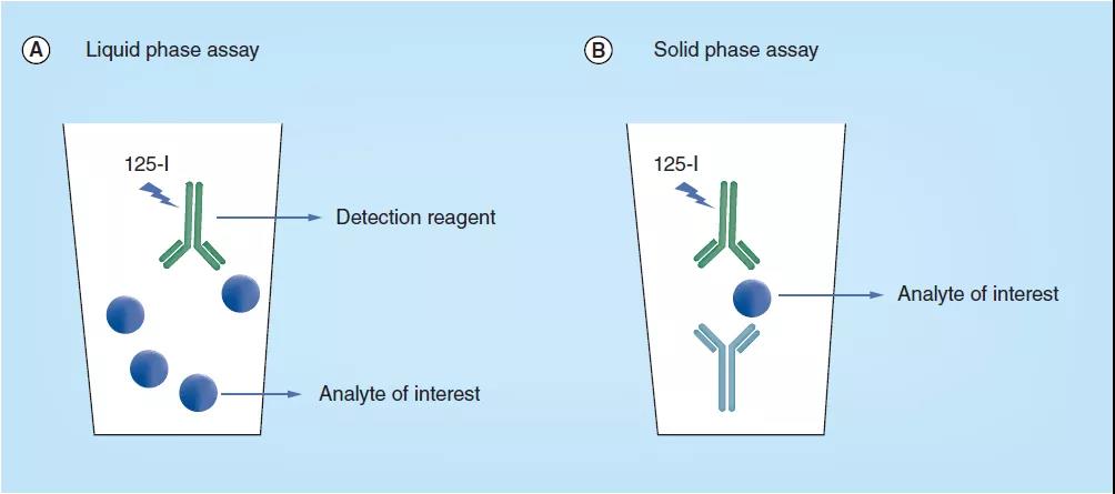 ͼ 1.ʹÓ÷ÅÉäÐÔ±ê¼Ç¼ì²âÊÔ¼ÁµÄÒºÏࣨA£©ºÍ¹ÌÏࣨB£©ÍŽá²âÊÔµÄÔ­Àíͼ