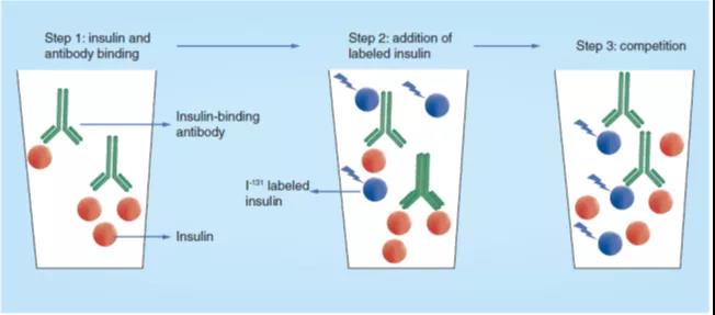 ÔÚÕâÖÖÒªÁìÖУ¬ÓÉÓÚȱ·¦ÈËÀàÒȵºËصĽᾧÌ壬Òò´ËI131±ê¼ÇµÄ½á¾§Å£ÒȵºËØ£¨ÒȵºËØ-I131£©±»ÓÃ×÷ʾ×Ù¼Á¡£´Ë RIA µÄÔ­ÀíÊÇ»ùÓÚÑù±¾ÖеÄÈËÒȵºËØÓëëàÊóѪÇåÖеÄÒȵºËØÍŽΌÌåµÄÇ¿Á¦ÍŽᣨͼ2Öеİ취1£©£¬²¢ÈÃÒÑ֪Ũ¶ÈµÄÒȵºËØ-I131Óë¸Ã¿¹ÌåµÄÍŽᾺÕù£¨Í¼2°ì·¨2-3£©¡£ÒȵºËØ-I131ÓëÒȵºËØÍŽΌÌåµÄÍŽáÔÚÈÜÒºÖоÙÐУ¬ÓÎÀëµÄÒȵºËØ-I131ÓëÍŽáÁË¿¹ÌåµÄÒȵºËØ-I131µÄÊèɢͨ¹ýֽɫÆ×µçÓ¾ÊÖÒÕʵÏÖ£¬Õâ¾ÍʹµÃ¶¨Á¿²â¶¨ÒȵºËØ-I131³ÉΪ¿ÉÄÜ£¬Æä´ú±íÁËÑù±¾ÖÐÒȵºËصÄŨ¶È¡£ÔÚ´ËÒªÁìÖУ¬×îµÍ¿É¶¨Á¿µÄÒȵºËØÅ¨¶ÈΪ1.4¦ÌU¡£