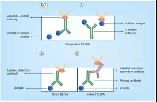 ͼ3. ¾ºÕùʽ£¨Ai & Aii£©¡¢Ö±½Ó£¨B£©ºÍ¼ä½Ó£¨C£©ELISA²âÊÔÃûÌõÄÔ­Àíͼ¡£Ä¿µÄÆÊÎöÎAnalyte£©´ú±í±»²â¶¨µÄÄ¿µÄÂѰ×ÖÊ¡£ÔÚ¾ºÕùʽELISAÖУ¬¿ÉÒÔ±ê¼ÇÄ¿µÄÆÊÎöÎï»ò¿¹Ì壬¶øÔÚÖ±½Ó»ò¼ä½ÓELISAÃûÌÃÖУ¬Ö»±ê¼Ç¼ì²â¿¹Ìå¡£