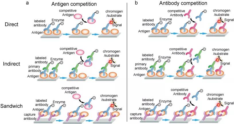 ͼ5. ¾ºÕùʽELISAµÄÏêϸԭÀíºÍÁ÷³Ìͼ¡£¿¹Ô­¾ºÕùʽELISA£¨a£©£¬¿¹Ì徺Õùʽ ELISA£¨b£©