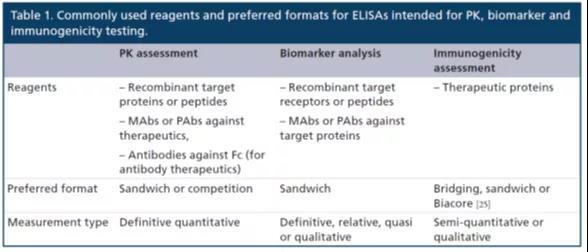 Ò»¸öELISAÒªÁì×îÖ÷ÒªµÄ×é³É²¿·ÖÊDzâÊÔÊÔ¼Á£¬Ëü¾öÒéÁËELISAÒªÁìµÄѸËÙ¶È¡¢ÌØÒìÐÔºÍÒªÁìµÄÖÊÁ¿¡£ELISAs³£ÓÃÓÚÒ©Î↑·¢£ºÔÚPKÆÀ¹ÀÖУ¬¶¨Á¿²â¶¨ÂѰ×ÉúÎïÒ©µÄŨ¶È£»²â¶¨ÄÚÔ´ÐÔÂѰ׺ÍÉúÎï±ê¼ÇÎ¼ì²â¿¹Ò©ÎÌåµÄ±£´æÒÔ¾ÙÐÐÃâÒßÔ­ÐÔÆÀ¹ÀµÈ¡£LBAÒªÁìÊ×Ñ¡µÄÒªº¦ÊÔ¼ÁÊǵ¥¿Ë¡¿¹Ì壨MAbs£©»ò¶à¿Ë¡¿¹Ì壨PAbs£©£¬¶ø²»ÊÇÖØ×é°Ð±êÂѰס£ÎªÁ˱¬·¢PAbs»òMAbs£¬ÐèÒª½«ÉúÎïÒ©»òÉúÎï±ê¼ÇÎïÂѰ׼°Æä×ô¼Á»òÔØÌ壬ƾ֤Ïà¹ØÓ¦Óøøµ½ºÏÊʵÄËÞ×Ô¶¯ÎïÎïÖÖÉϾÙÐÐÃâÒß¡£¹ØÓÚPAbs£¬ÍÃ×Ó¡¢É½ÑòºÍÃàÑòÊÇ×î³£ÓõÄËÞÖ÷ÎïÖÖ£¬ÓÉÓÚËüÃǵÄÌåÐʹ󣨱¬·¢µÄ¿¹ÌåÁ¿Ò²´ó£©£¬ÈÝÒ×ÕÒµ½Ñª¹ÜºÍǿ׳µÄÃâÒß·´Ó¦¡£
