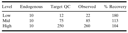 ËùÍøÂçµÄÉúÎïÑùÆ·ÖеĴý²âÎï±£´æÓÚ²î±ðµÄ»ùÖÊÖУ¬°üÀ¨Ñª½¬¡¢ÑªÇå¡¢ÄòÒº¡¢ÄÔ¼¹Òº£¨CSF£©¡¢ÊàŦ»¬ÒººÍ¾ùÖÊ»¯µÄ×éÖ¯¡£ÓÉÓÚ´ý²âÎïµÄÌØÕ÷»áÊܵ½Ñù±¾ÖƱ¸ÒªÁìÓ°Ï죬Òò´Ë±ØÐèÔÚÑù±¾ÊÕÂÞÀú³ÌÖÐÆÀ¹ÀÈçÏÂÒòËØ£ºËùÐèÒªµÄÈκÎÌí¼Ó¼Á£¨¿¹Äý¼Á¡¢ÂѰ×øÒÖÖÆ¼ÁµÈ£©¡¢´ý²âÎïµÄÎȹÌÐÔ£¨Ñª½¬»òѪÇåÊèɢǰµÄȫѪ£©¡¢Ñù±¾ÍøÂçºóµÄ´¦Öóͷ£ºÍÖü´æÌõ¼þ£¨Î¶ȡ¢Æ¿Ð͵ȣ©¡£²âÊÔÃûÌá¢Ñù±¾ÍøÂçÌõ¼þºÍÆäËûÒòËØ¿ÉÄÜ»áÓ°Ïì»ùÖʵÄÑ¡Ôñ£¬ÀýÈçÈôÊÇʹÓÃ×Ô¶¯»¯Ñù±¾´¦Öóͷ£ÏµÍ³£¬ÔòѪÇ彫ÊÇÊ×Ñ¡µÄ»ùÖÊ£¬ÓÉÓÚѪ½¬ÖÐͨ³£º¬ÓÐѪÏËάÂѰ×Äý¿é£¬¿ÉÄÜ»á×ÌÈÅÒÆÒº²Ù×÷¡£Ïà±È֮ϣ¬Ñª½¬ÊDz»Îȹ̴ý²âÎïµÄÊ×Ñ¡»ùÖÊ£¬ÓÉÓÚÖÆ±¸ÑªÇåËùÐèµÄʱ¼ä½Ï³¤£¬²¢ÇÒ±£´æÂѰ×Ë®½âø£¨proteolytic enzyme£©½µ½âÂѰ׵ÄÎÊÌâ¡£±¾ÎÄÉԺ󽫶ÔÑù±¾ÍøÂçºó»ùÖÊÖеĴý²âÎï¾ÙÐиüÈ·ÇеÄÎȹÌÐÔÆÀ¹À¡£¼Ó±êÑùÆ·£¨spiked sample£©µÄ»ùÖÊÓ¦µ±ÓëÔ¤ÆÚµÄδ֪Ñо¿Ñù±¾µÄ»ùÖÊÏàͬ£¬ÒªÊ¹ÓÃÏàͬµÄ»ùÖÊÖÆ±¸±ê׼Ʒ£¨±ê/У׼Ʒ£¬standard/calibrator£©¡£µ±ÔÚ»ùÖÊÖмì²â²»µ½ÄÚÔ´ÐÔÐźÅʱ£¬¼òÆÓµØ¼Ó±ê/½ÓÄÉÑо¿¾Í×ãÒÔÈ·¶¨ºÏÊʵĿÕȱ»ùÖÊ¡£ÔÚÕâЩÌõ¼þÏ£¬½¨ÒéʹÓÃ±ê³ÆÅ¨¶È£¨nominal concentration£©¡£Ïà·´£¬µ±»ùÖÊÖб£´æ¿É¶¨Á¿µÄÄÚÔ´ÐÔÎïÖÊ£¬²¢ÇÒÄÚÔ´ÐÔÎïÖʺÍÍâ¼Ó´ý²âÎïµÄ½ÓÄÉÂÊÊÇÀÛ¼Óʽ£¨ÏßÐÔ£©µÄʱ¼ä£¬¿ÉÒÔÓ¦ÓÃÒ»¸öУÕýÒò×Ó£¨ÀýÈçÄÚÔ´ÐÔŨ¶È4ng/mL£¬¼Ó±êÆÊÎöÎïΪ6ng/mL£¬ÀÛ¼ÓЧӦΪ10ng/mL£©¡£ÔÚÕâÖÖÇéÐÎÏ£¬¿É½«Ëù²â¶¨µÄÄÚÔ´ÐÔŨ¶ÈÓëËùÌí¼ÓµÄ´ý²âÎïŨ¶È£¨±ê³ÆÖµ£©Ïà¼ÓÀ´»ñµÃÖ¸¶¨Öµ£¨assigned value£©£¨±íIIAºÍ±íIIB£©¡£±íIIA.ÄÚÔ´ÐÔÂѰ×ÀÛ¼ÓТ˳ЧӦµÄʾÀý¡£ÔÚÕâÖÖÇéÐÎÏ£¬ÄÚÔ´ÐÔÂѰ׵ÄÓ°Ïì¿ÉÒÔÔÚµÍÖÊÁ¿±ÈÕÕÑùÆ·£¨QC£©ÖÐÊӲ쵽£»µ«Æä¶ÔÖС¢¸ßˮƽÖÊÁ¿±ÈÕÕÑùÆ·µÄÓ°Ïì²»´ó¡£