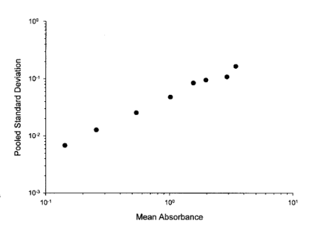 ͼ2. ±íIVËùÁбê×¼ÇúÏßÎü¹â¶ÈÖµµÄ»ìÏýÔËÐУ¨batch£©ÄÚ±ê×¼·½²îÓëÀÛ»ýƽ¾ùÏìÓ¦Ö®¼äµÄ¹ØÏµ¡£Ã¿¸öµã´ú±íÒ»¸öŨ¶ÈµãµÄƽ¾ùÖµºÍͨ¹ý·½²îÆÊÎö£¨ANOVA£©ÅÌËãµÄ±ê×¼·½²î¡£ÔÚ¸ßÎü¹â¶ÈˮƽÏ£¬±äÒìÐԽϴó£»ÕâÅú×¢£¬ÔÚÄâºÏ±ê×¼ÇúÏßʱ£¬¼ÓȨ¿ÉÄÜÊÇÊʵ±µÄ¡£