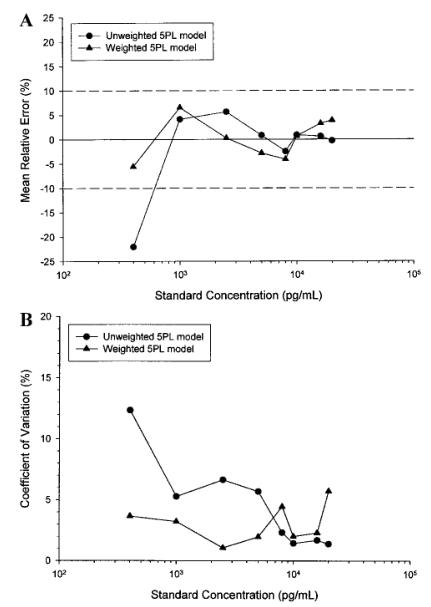 Ò»¸ö¿É±»½ÓÊܵÄУ׼ģ×Ó£¬ÆäÇúÏßµÄÀÛ»ý»ØËãÊýÖµ¹ØÓÚÔÚÔ¤ÆÚµÄ¶¨Á¿¹æÄ£ÄÚµÄËùÓÐŨ¶È£¬Ó¦¾ßÓÐ10%µÄ¾ø¶Ôƽ¾ùREÖµºÍ15%µÄ±äÒìϵÊý£¨CV£©£¨°Ý¼û±íV£©¡£ÔÚУ׼ƷŨ¶È¹æÄ£ÖУ¬ÈôÊÇÆ½¾ùRE±£´æÒ»¸öÇ÷ÊÆ£¬¼´»ØËãŨ¶ÈʼÖÕÒ»ÖµظßÓÚ»òµÍÓÚ±ê³ÆÅ¨¶È£¬ÔòÊÇÄâºÏʧ°ÜµÄÖ¤¾Ý£¬»áʹ¸ÃÄ£×ÓʧЧ¡£ÄâºÏʧ°Ü¿ÉÄÜÊÇÓÉÓÚÑ¡ÔñÁ˲»¶ÔÊÊµÄÆ½¾ùÖµº¯Êý£¨ÀýÈ磬ÔÚŨ¶È-ÏìÓ¦ÇúÏß²î³Ø³ÆÊ±Ê¹ÓÃÁË4PLº¯Êý£©»ò¼ÓȨÀú³Ì²»µ±¡£ÀýÈ磬¼ÓȨʹµÃÄâºÏµÄÇúÏßÓë±íIVÖеÄÊý¾Ý¸üÏà·û£¬ÆäÖ¤¾ÝÊÇ£ºÔڽϵÍŨ¶È²¿·Ö£¬½µµÍÁËÆ½¾ùRE(ͼ3A)ºÍCV(ͼ3B)£»¶øÔڽϸßŨ¶È²¿·Ö£¬×¼È·ÐÔ»òϸÃܶȵÄËðʧ¼«Ð¡¡£Í¼3. A.δ¼ÓȨºÍ¼ÓȨÎå²ÎÊýlogistic(5PL)»Ø¹éÇúÏß»ØËãŨ¶ÈµÄÀÛ»ýƽ¾ùÏà¶ÔÎó²î°Ù·Ö±ÈµÄ½ÏÁ¿Óë±íIVµÄÎü¹â¶ÈÊý¾ÝÏàÎǺϡ£¼ÓȨģ×ÓµÄЧ¹ûÔÚÕû¸ö±ê׼Ũ¶È¹æÄ£ÊÇ¿ÉÒÔ½ÓÊܵ쬶ø·Ç¼ÓȨģ×ÓÔÚµÍÓÚ1000pg/mLŨ¶ÈÊDz»¿É½ÓÊܵġ£B.δ¼ÓȨºÍ¼ÓȨÎå²ÎÊýlogistic (5PL)»Ø¹éÇúÏß»ØËãŨ¶Èת±äµÄÀÛ»ý°Ù·Ö±ÈϵÊýµÄ½ÏÁ¿Óë±íIVµÄÎü¹â¶ÈÊý¾ÝÏàÎǺϡ£¼ÓȨ»Ø¹éÄ£×ÓµÄÅÌËãÖµ×ܽáÈçÏÂÔÚ±íVÖС£¼ÓȨģ×ÓÔڽϵÍŨ¶ÈˮƽÏ»ñµÃÁ˽ÏСµÄÅú¼äת±äϵÊý¡£