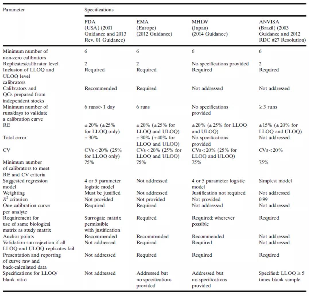 Ä¿½ñ£¬Ò»Ð©ÉúÎïÆÊÎöÖ¸ÄÏ»ò¹æÔòÎļþµÄÉúÎïÆÊÎö²¿·ÖÒѾ¶ÔУ׼±ê×¼ÇúÏßµÄ×îµÍÒªÇó¾ÙÐÐÁËÈ·¶¨¡£ÕâЩָµ¼ÐÔÎļþ¶ÔLBAÇúÏßµÄÐèÇóºÍÐÔÄÜÔ¤ÆÚͨ³£ÊÇÏ໥һÖµġ£±í1×ܽáÁËÀ´×ÔÃÀ¹úʳÎïºÍÒ©Îï¹ÜÀí¾Ö(FDA)¡¢Å·ÖÞÒ©Æ·¹ÜÀí¾Ö(EMA)¡¢ÈÕ±¾ÎÀÉú¡¢ÀͶ¯ºÍ¸£Àû²¿(MHLW)ºÍ°ÍÎ÷ÎÀÉúî¿Ïµ»ú¹¹(ANVISA)¶ÔУ׼ÇúÏßµÄÒªÇó¡£FDAºÍEMAÖ¸ÄÏÊǾø´ó´ó¶¼ÉúÎïÆÊÎöʵÑéÊÒ×ñ´ÓµÄÖ÷ÒªÖ¸ÄÏ¡£¸÷¸öÖÆÒ©³§ÉÌӦƾ֤¸÷×ÔÍýÏëËùÌá½»µÄÐÂÒ©ÉóºËî¿Ïµ»ú¹¹À´¾öÒé×ÔÉíÐèÒª×ñ´ÓµÄÖ¸ÄϹæÔò¡£
