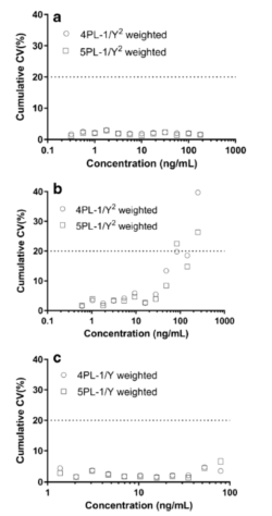 ͼ6ÏÔʾ£¬¹ØÓÚ¼ÓȨ4PLºÍ¼ÓȨ5PLÇúÏßÄâºÏÄ£×Ó£¬ËùÓÐУ׼µãµÄÀÛ¼Æ%CV£º°¸ÀýA£¬µÍÓÚ3.0ºÍ2.9%£»°¸ÀýB£¬µÍÓÚ39.7%ºÍ26.3%£»°¸ÀýC£¬µÍÓÚ6.6%ºÍ10.8%¡£°¸ÀýAºÍC¶ÔÁ½¸öÄâºÏÄ£×Ó¼ÓȨÄâºÏºó£¬ËùÓÐУ׼µãµÄ %CV±äµÃÏ൱ÁË¡£¶Ô°¸ÀýAºÍC£¬ËùÓÐУ׼µãµÄ¼ÓȨ4PLºÍ¼ÓȨ5PLµÄϸÃܶÈÒ²ÊÇÏàËÆµÄ¡£Æ¾Ö¤Ï¸ÃܶÈÐÐÎªÍ¼ÍÆ¶ÏµÄROQ»®·ÖΪ0.317-178 ng/mL£¨°¸ÀýA£©ºÍ1.37-79.3 ng/mL£¨°¸ÀýC£©¡£Ê¹ÓüÓȨ4PLÄ£×Ó£¬Óë¼ÓȨ5PLÄ£×ÓÏà±È£¬°¸ÀýB¿ÉÒÔ½ÓÊܵÄУ׼µãÊýÄ¿´Ó9ÔöÌíµ½11£¬¼ÓȨ4PLÄ£×ӵĹÀËãµÄROQ Ϊ 0.602-145 ng/mL£¬¶ø¼ÓȨ5PLÄ£×ӵļì²â¹æÄ£½ÏÕ­£º0.602 - 48.3 ng/mL¡£Æ¾Ö¤½ÓÊܱê×¼£¬¹ØÓÚ°¸Àý A¡¢B ºÍ C £¬×îÖÕ¿ÉÒÔ½ÓÊܵÄÇúÏßÄâºÏÄ£×Ó¶¼ÊÇ4PL£¬È¨Öغ¯Êý»®·ÖΪ 1/Y2£¬1/Y2ºÍ1/Y¡£