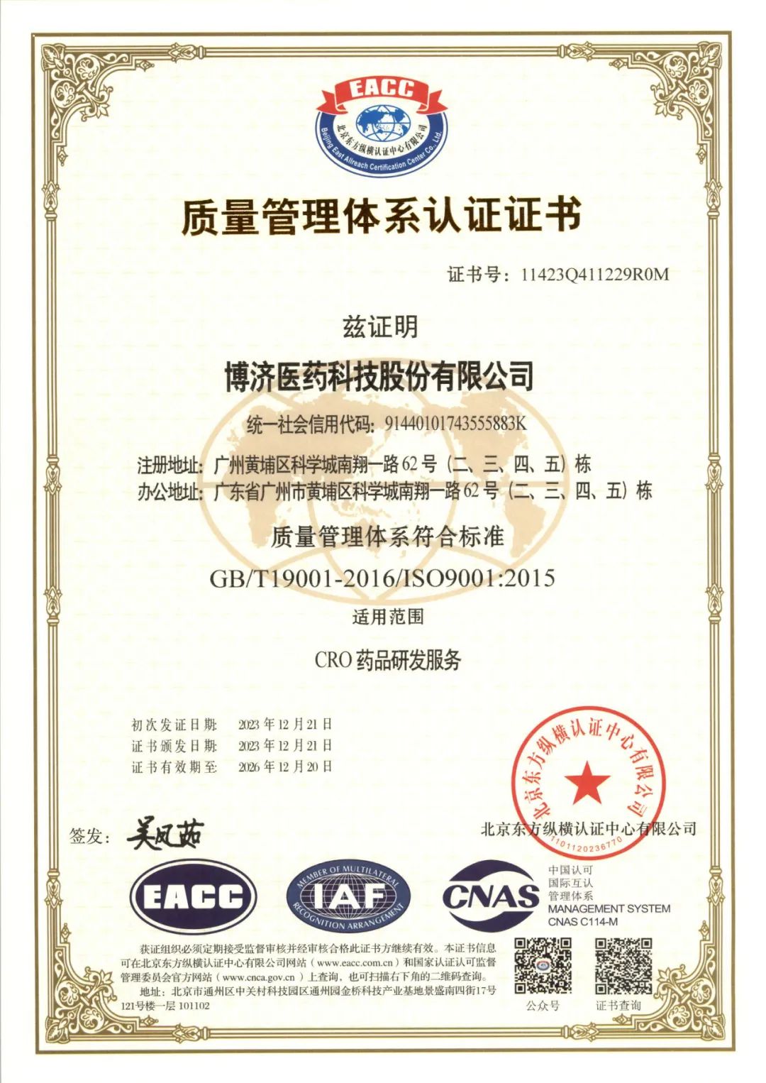 克日,333体育官网医药通过ISO9001质量管理认证机构专家周全、严酷、详尽的审核,乐成获得GB/T19001-2016/ISO 9001:2015标准质量管理系统认证证书,确认我司的手艺水平、条件、管理切合 ISO9001质量管理系统标准的要求,认证规模为“CRO药品研发服务”。